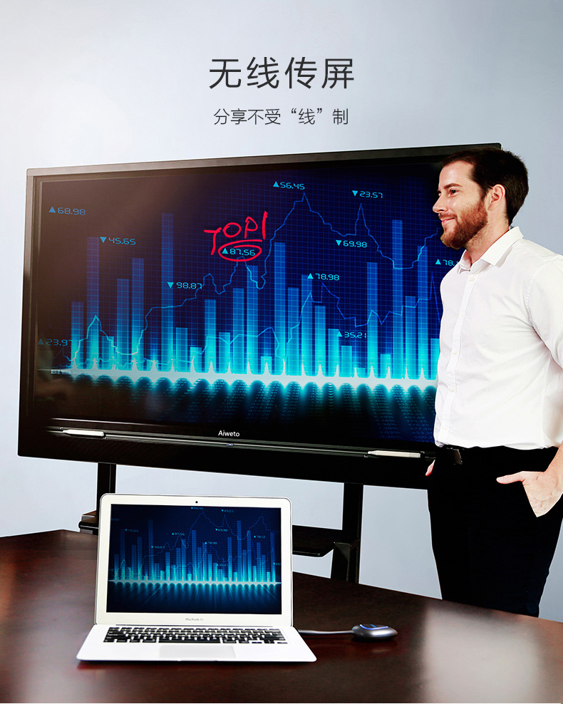 Aiweto(艾維圖)會議多媒體觸摸一體機采用LG商用IPS硬屏,全高(1920*1080)顯示,具有178度視角,高對比度和亮度,3D數字降噪,智能消除殘影、重影等失真現象,使得顯示畫面更清晰,穩定,色彩更鮮艷
